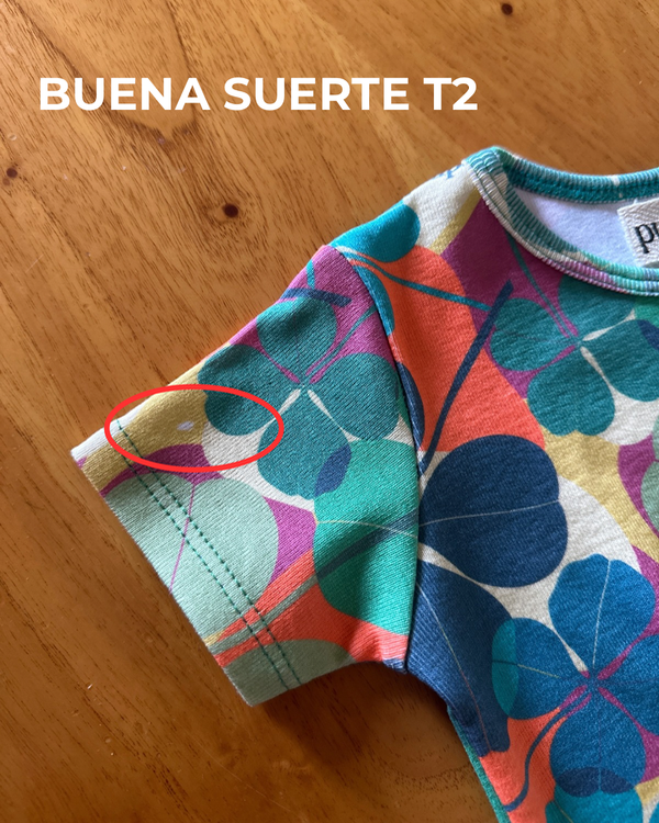FALLA: pequeña falla de estampa en manga delantera derecha de la remera. Es mínima.