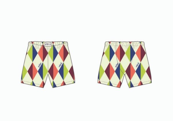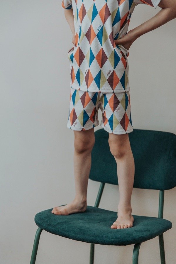 Dos piezas: remera y pantalón corto con recorte en trasera.