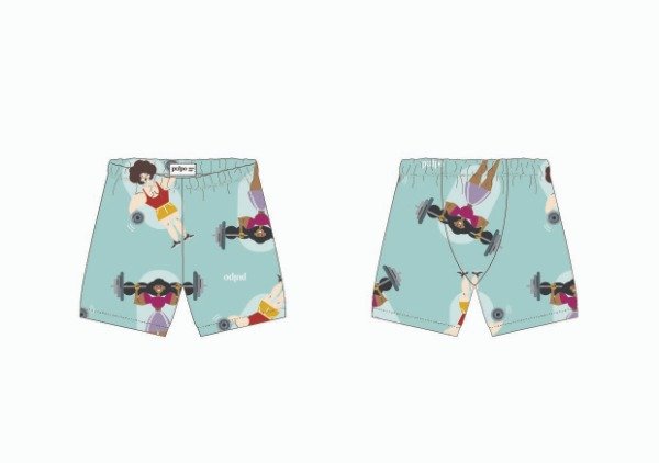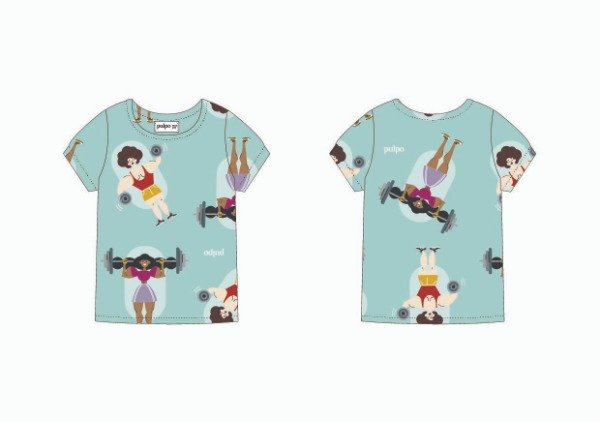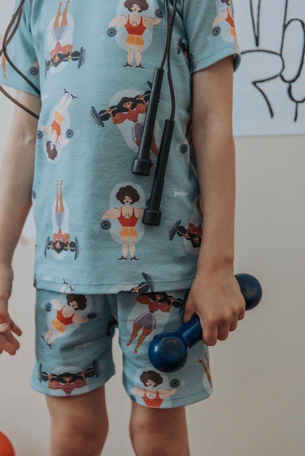 Dos piezas: remera y pantalón corto con recorte en trasera.